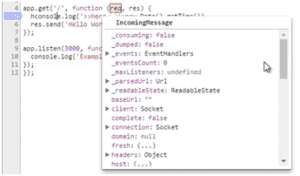 Agora vamos rodar nosso localhost:3000 e quando voltamos para o devtools, perceba que ele parou e nós conseguimos checar o que tem dentro do req, res: