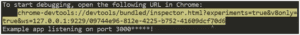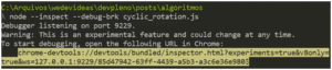 node --inspect --debug-brk cyclic\_rotation.jsPercebam que eu não tenho nada de assíncrono no meu algoritmo, mas mesmo assim ele deu uma URL para depurar: