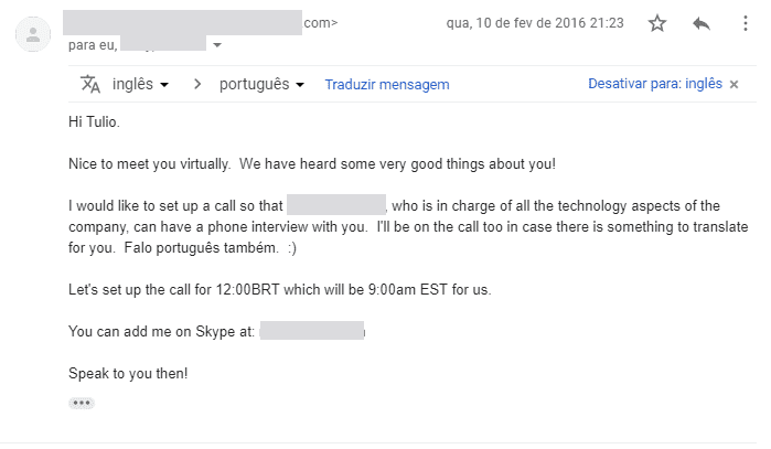 E apesar do e-mail estar em português, ela estava em Nova Iorque e precisava resolver um grande problema no projeto. Toda a negociação aconteceu durante a terça feira de carnaval e quarta-feira de cinzas. Ao final da quarta-feira de cinzas, eu estava contratado - com contrato assinado e tudo mais - e já tinha recebido um e-mail (em inglês) de um outro membro da equipe para falar com o CTO (eu havia sido contratado pela CEO).